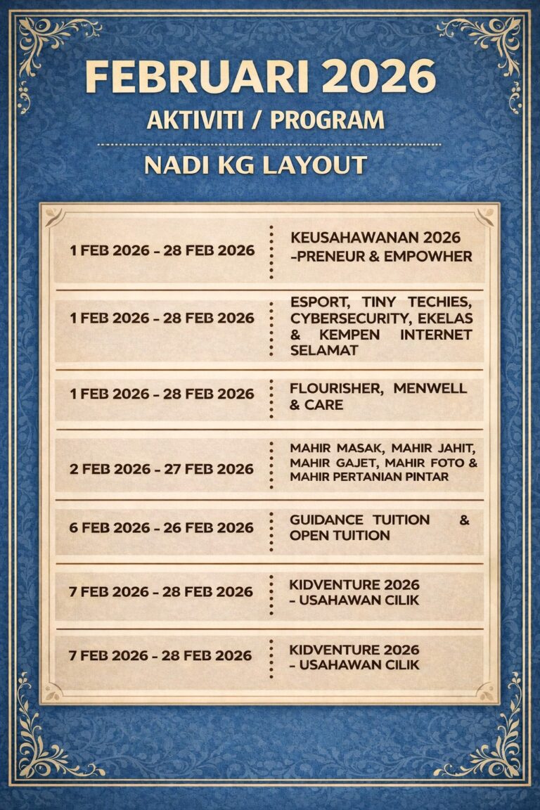 Tarikh : 07 Februari 2026 Masa : 10.00 Pagi – 11.00 Pagi Lokasi : NADI Kg Layout Peserta : 5 orang Tujuan Memberi pengenalan kepada peserta tentang program khas NADI-KEMPEN INTERNET SELAMAT yang akan disertai oleh peserta secara atas talian. Menarik […]